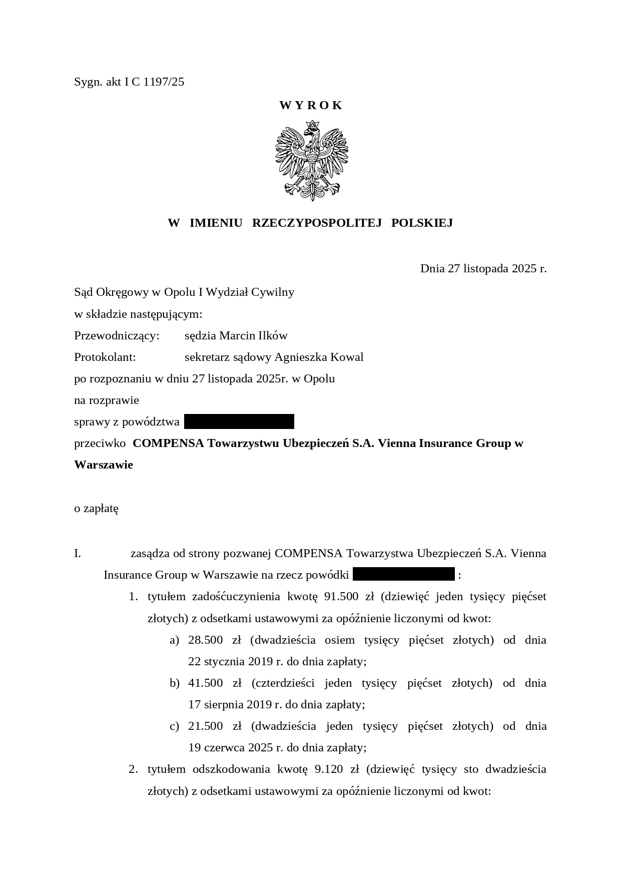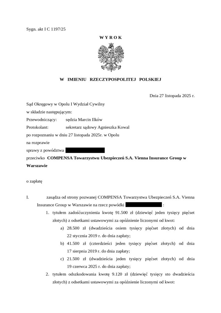 Prawomocna wygrana z zakładem ubezpieczeń Compensa o świadczenia odszkodowawcze!