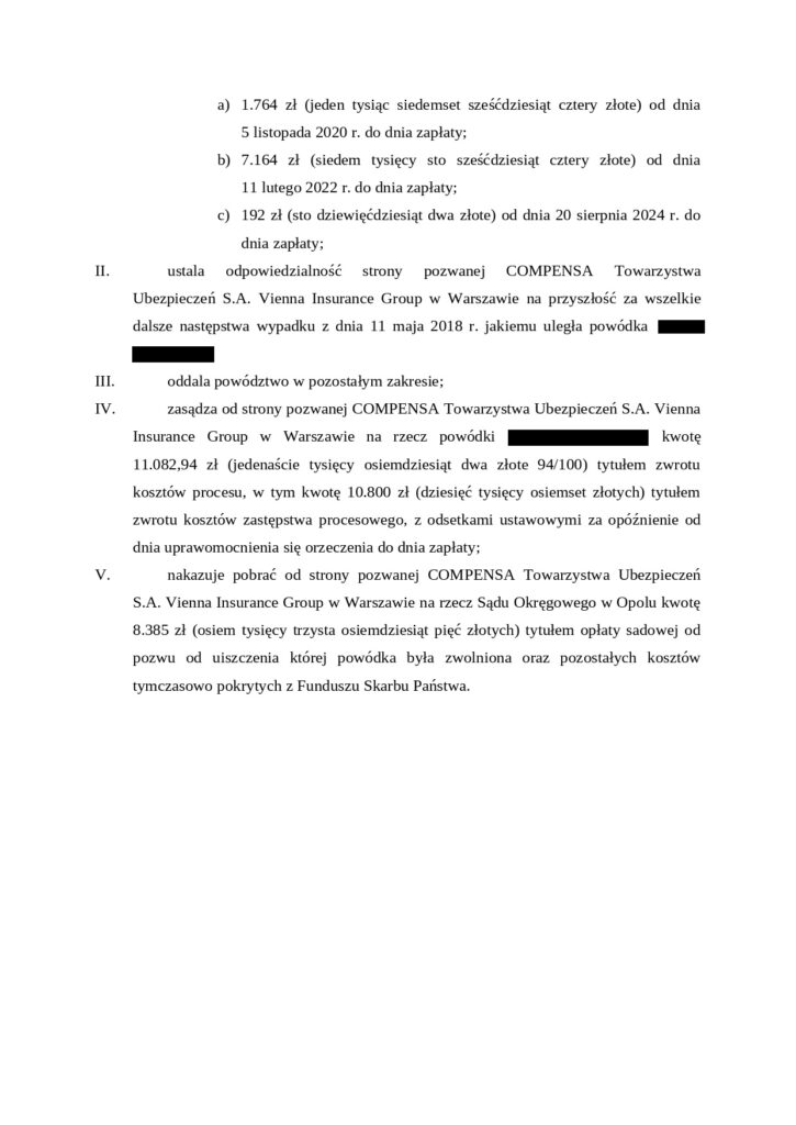 Obok zadośćuczynienia Sąd Okręgowy w Opolu zasądził na rzecz poszkodowanej również odszkodowanie w związku z opieką sprawowaną przez osoby najbliższe oraz odsetki ustawowe za opóźnienie, znacząco zwiększające globalnie uzyskane sumy. Determinacja i profesjonalna pomoc prawna zaowocowały! 👩‍⚖️